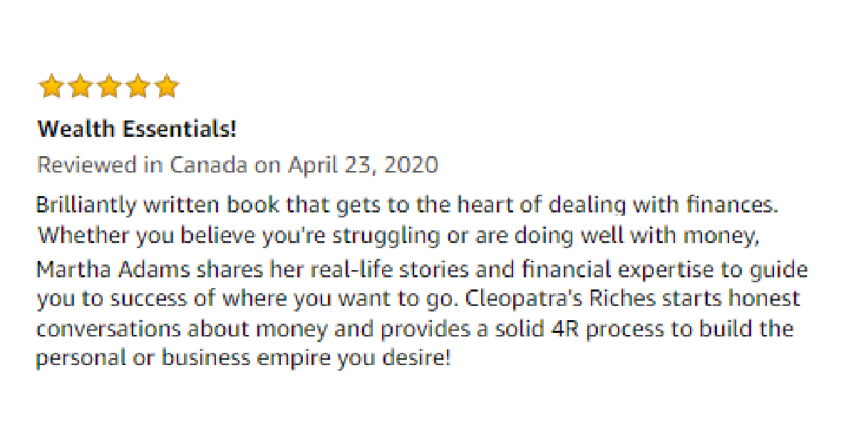 In the newly revised edition of Cleopatra’s Riches: Transforming Money, Business, and Relationships Through Emotional Mastery, internationally renowned Certified Financial Planner and financial educator, Martha Adams, reveals a transformative new way to think and feel about, and engage with, money. She offers a fresh, human-centered approach that puts you at the heart of your own personalized financial journey.